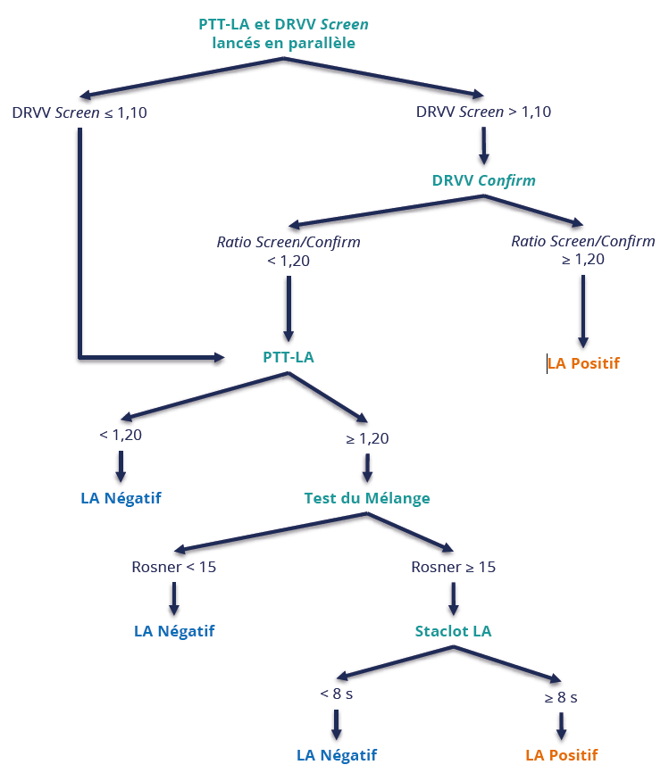 o INR entre 1 et 3 : le PTT-LA et le DRVV sont réalisés. Toutefois, le DRVV est réalisé sur un mélange volume à volume du plasma du patient avec un pool de plasma normal ;