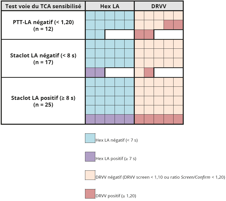 Pour chacun des groupes (« PTT-LA négatif », « Staclot LA négatif » et « Staclot LA positif »), les résultats du Hex LA et du DRVV sont indiqués (couleur claire : négatif, couleur foncée : positif). Chaque carré correspond à un échantillon ; la même position dans les colonnes Hex LA et DRVV indique qu’il s’agit du même échantillon.