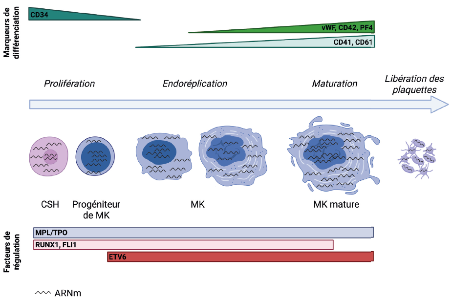 La mégacaryopoïèse se déroule en trois grandes étapes : la prolifération des cellules dans les premiers stades, l’endoréplication (ou endomitose) conduisant à la formation de mégacaryocytes (MK) polyploïdes, puis la phase de maturation cytoplasmique. Cette dernière est marquée par une augmentation de la synthèse d’ARN messagers et de protéines, ainsi que par la biogenèse des organelles plaquettaires, notamment les granules α, qui stockent des protéines clés. Finalement, les MK produisent des proplaquettes, précurseurs des plaquettes circulantes. L’analyse des antigènes de surface a permis de défi nir les stades de diff érenciation cellulaire. Les cellules progénitrices expriment CD34, tandis que les cellules plus diff érenciées présentent des marqueurs plus spécifi ques comme le complexe α2b β3 (GPIIb/CD41 et GPIIIa/CD61), GPIX (CD42a), GPV (CD42d), GPIb (CD42b), le facteur von Willebrand (vWF) et le facteur plaquettaire 4 (PF4). La régulation de la mégacaryopoïèse repose sur l’action coordonnée de cytokines et de facteurs de croissance, notamment la thrombopoïétine (TPO) et son récepteur MPL, ainsi que sur l’activité de facteurs de transcription tels que RUNX1, FLI1 et ETV6 indispensables à la diff érenciation et à la maturation des MK.