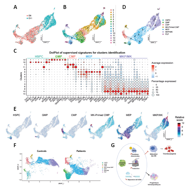 Application des signatures transcriptomiques aux cellules des patients porteurs de variants ETV6. L’analyse combinée des approches supervisée et non supervisée des cellules témoins a permis de définir les signatures transcriptomiques des différents types cellulaires présents dans le modèle de culture (Figure 3D-E). Les signatures ont ensuite été appliquées aux cellules des patients. Les mêmes types cellulaires ont été retrouvés (à l’exception du cluster PLP), bien que les proportions soient altérées. Les patients présentaient un enrichissement en progéniteurs immatures et une diminution des MK matures, indiquant un blocage partiel de la différenciation, cohérent avec le phénotype observé (Figure 3F).