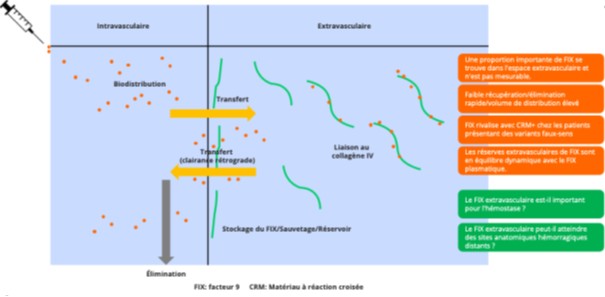 La capacité du facteur IX (FIX) à se lier de façon réversible au collagène IV (ColIV) conditionne sa biodistribution entre compartiment intravasculaire, mesurable, et extravasculaire, non accessible aux dosages usuels, mais participant pleinement à l’hémostase. Après passage du plasma vers le sous-endothélium, voire plus profondément dans la paroi vasculaire, le FIX peut être relargué dans la circulation. Ce pool tissulaire, situé à proximité du complexe FVIIa–facteur tissulaire, contribue en partie à l’hémostase et une altération de la liaison du FIX au ColIV est associée à une tendance hémorragique majorée chez les souri (Figure 1).