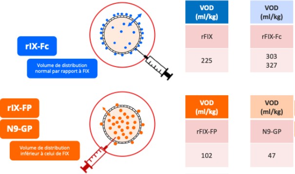 Ces éléments de pharmacocinétiques sont également essentiels pour interpréter les différences pharmacocinétiques entre les différents FIX à demi-vie prolongée (EHL). Si le FIX, qu’il soit fusionné au fragment Fc d’une IgG (rIX-Fc), à l’albumine (rIX-FP) ou pégylé (N9-GP) affiche une efficacité clinique globalement comparable, les taux résiduels plasmatiques différents, sans corrélation avec le phénotype hémorragique. Or, les modifications du FIX influencent sa biodistribution et sa liaison au ColIV. Le FIX-Fc diffuse davantage en extravasculaire et ne modifie pas l’affinité du FIX natif pour le ColIV, ce qui se traduit par un volume de distribution supérieur (300 ml/kg vs 100ml/kg pour le FIX-FP et 50ml/kg pour le N9-GP) ; ainsi, des saignements rapportés sous FIX-FP malgré des taux plasmatiques élevés interrogent sur la signification clinique des taux résiduels (Figure 2).