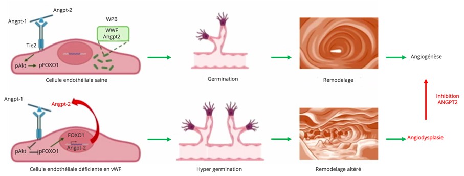 Le facteur Willebrand (VWF) apparaît comme un régulateur clé de l’homéostasie vasculaire. Il limite l’angiogenèse : son absence dans les cellules endothéliales augmente la migration et la formation de tubes vasculaires (Starke et. al, Blood 2011). Récemment, l’équipe de A. Randi a démontré que le VWF contrôle le stockage de l’Ang2 dans les corps de Weibel-Palade et régule sa synthèse via FOXO1. En l’absence de VWF et donc des corps de Weibel-Palade, l’Ang2 est libérée de façon excessive, et inhibe alors le récepteur Tie2 qui n’active plus la voie PI3K/AKT. FOXO1 non phosphorylé passe donc dans le noyau et favorise la transcription d’Ang2, entrainant une boucle d’amplification (Figure 1).