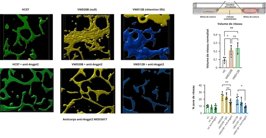 Ces résultats sont confirmés dans les modèles murins VWF-KO, qui présentent des anomalies marquées de la vascularisation intestinale et un déséquilibre de la balance Ang2/Ang1. Des modèles microfluidiques utilisant des cellules endothéliales issues de patients avec une VWD type 3 confirment une hyperangiogénèse de mauvaise qualité, réversible par blocage d’Ang2 (Figure 2) (Constantinescu-Bercu et al. Blood in press).