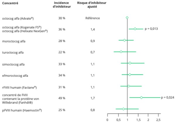 Au total, 444 patients ont développé un inhibiteur. Aucune différence significative de risque n’a été observée entre les concentrés plasmatiques et recombinants (30 % vs 31 %), ni entre les concentrés recombinants à demi-vie standard et ceux à demi-vie prolongée (30 %). L’analyse selon chaque marque de concentré, utilisant l’octocog alfa (Advate®) comme référence, met en évidence un risque plus élevé avec l’octocog alfa (Kogenate®) et le concentré de FVIII contenant la protéine von Willebrand (Fanhdi®), tandis que le turoctocog alfa est associé à un risque plus faible, mais le nombre de patients exposés reste assez faible (n = 40) (Figure 1).