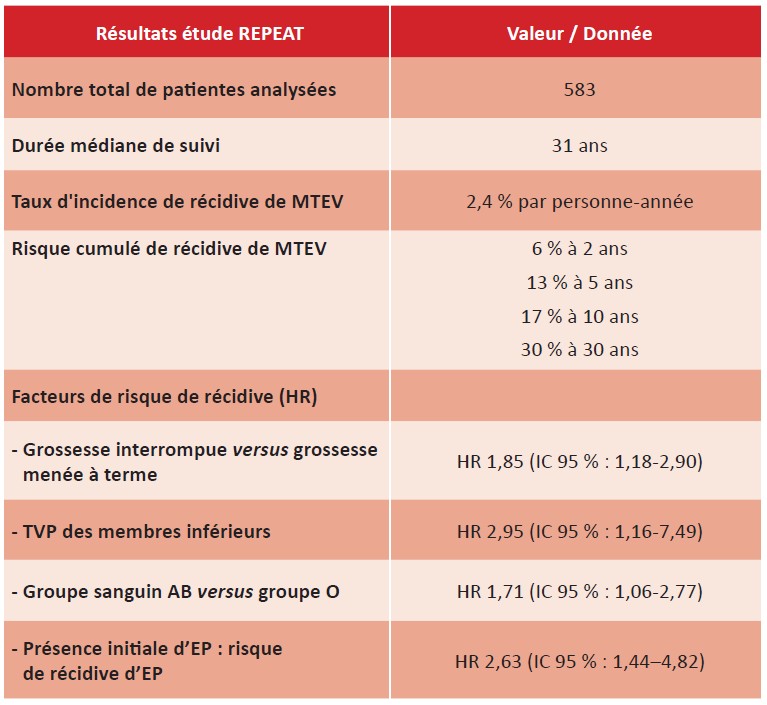 RISQUE ÉLEVÉ DE RÉCIDIVE À LONG TERME APRÈS UN PREMIER ÉPISODE DE THROMBOEMBOLIE VEINEUSE SURVENU PENDANT LA GROSSESSE OU EN POST-PARTUM : ÉTUDE REPEAT (RECURRENCE AFTER A PREGNANCY RELATED THROMBOSIS)