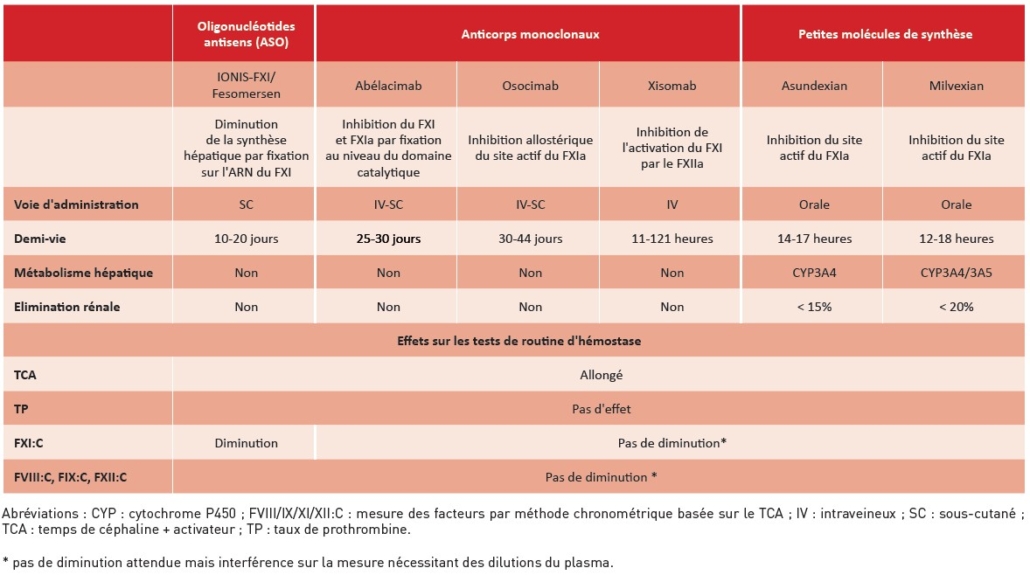Tableau 1 : Principales caractéristiques des anticoagulants ciblant le facteur XI(a) en développement et effets sur les tests de routine d’hémostase.
