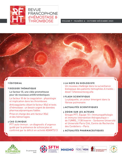 La N-glycosylation est un processus post traductionnel ubiquitaire qui consiste à assembler des chaînes glycanniques à la surface des protéines. Ces chaînes participent aux fonctions et à la stabilité des protéines dans l’organisme. Les protéines de la coagulation sont toutes des glycoprotéines, et l’étude des déficits héréditaires de glycosylation, encore appelés CDG (Congenital Disorders of Glycosylation), permet de mieux comprendre le rôle des chaînes glycanniques des protéines de l’hémostase. Une coagulopathie, associant des déficits en facteurs procoagulants et en inhibiteurs de la coagulation, accompagne souvent les syndromes CDG. Plus rarement, et dans certains types de CDG seulement, une atteinte de l’hémostase primaire est observée, pouvant être à l’origine d’une thrombopénie. Les anomalies de la coagulation restent les plus fréquemment observées, et sont caractérisées par des déficits en antithrombine et en facteur XI, suivis de près par une diminution de la protéine C, protéine S, ou encore du facteur IX. La présence de ces anomalies peut entraîner une augmentation du risque thrombotique et hémorragique. L’étude de la génération de thrombine nous a permis de mieux appréhender la résultante hémostatique de ces anomalies chez les patients atteints de CDG. La génération de thrombine mesurée chez les malades révèle une hypercoagulabilité. Cette hypercoagulabilité est renforcée par une résistance à la protéine C activée, mise en évidence après l’ajout de thrombomoduline soluble. Parmi les patients étudiés, tous ceux qui possèdent des antécédents de complications thrombotiques présentent un profil procoagulant, suggérant que la coagulopathie favoriserait la survenue de thromboses.