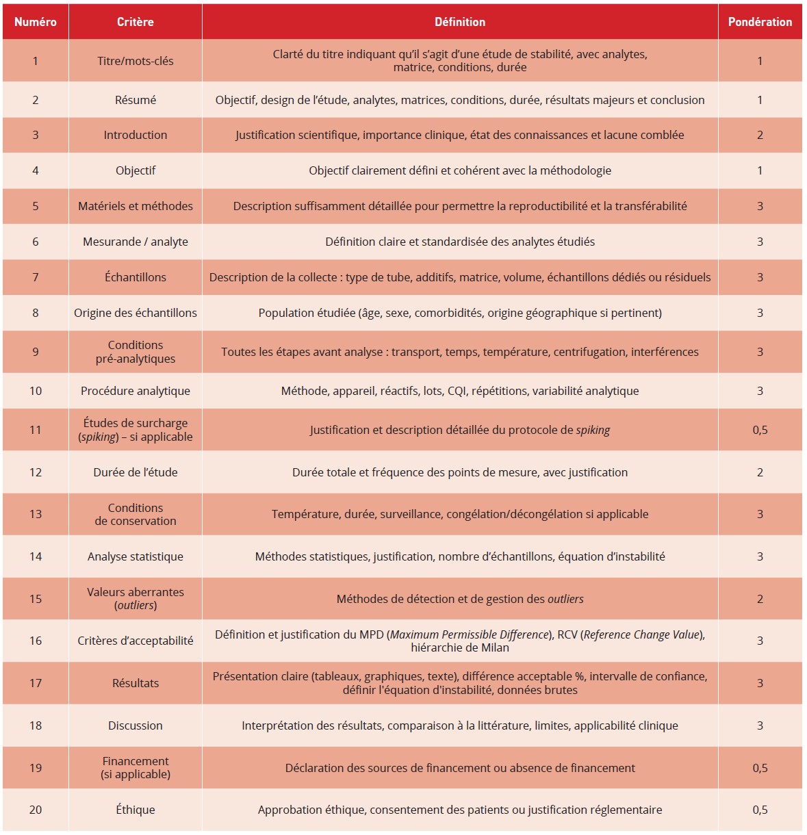 Tableau 1 : Liste des 20 critères CRESS (Checklist for Reporting Stability Studies) utilisée pour évaluer la qualité des études de stabilité en biologie médicale, telle que définie par l’EFLM WG-PRE. Chaque critère est évalué selon quatre niveaux de qualité (de 1 à 4).