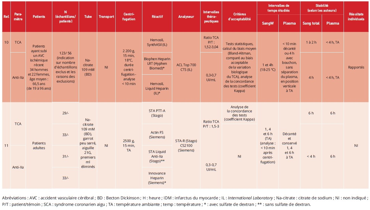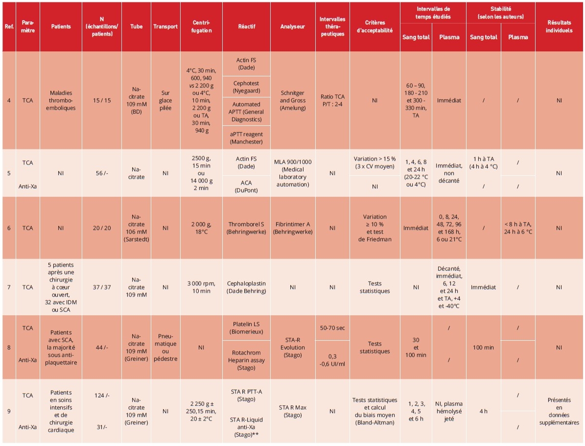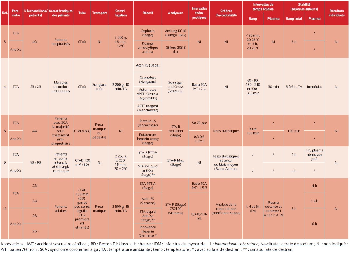 Tableau 3 : Synthèse des études et données disponibles sur la stabilité préanalytique du TCA et/ou de l’activité anti-Xa dans des échantillons collectés en tubes CTAD chez des patients traités par HNF à dose thérapeutique.